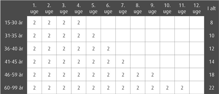 Der anbefales 2 behandlinger om ugen de første 4-6 uger for at booste collagenproduktionen, alt efter alder. Derefter 1 gang om ugen for at vedligeholde resultatet (kan variere – se skema nedenfor), således vil huden altid fremstå så pæn som muligt.